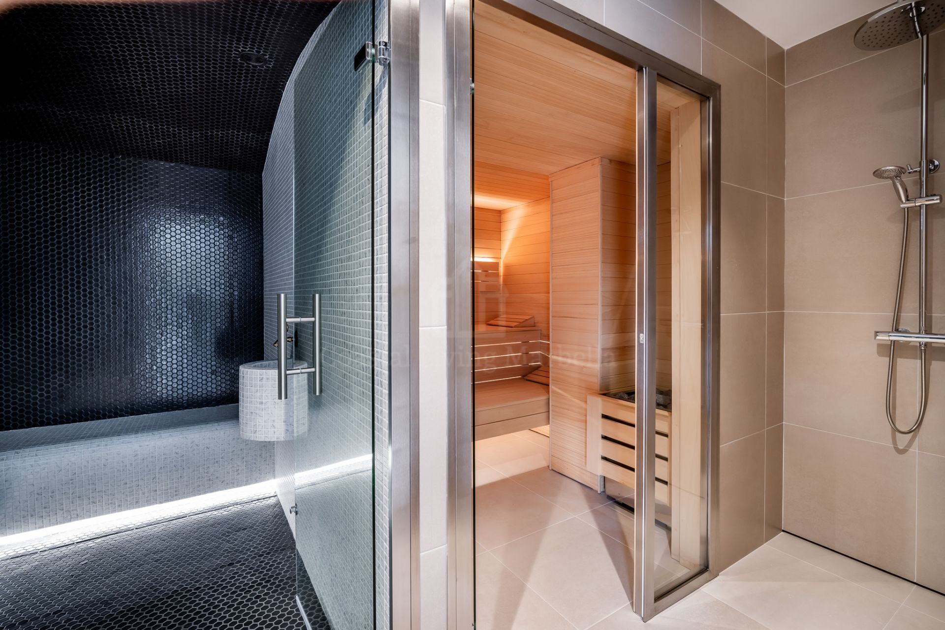 After dinner, the sauna’s cedar warms the skin; the steam room slows the mind. The house moves with you—lights dim, doors glide, everything in its place—until the only thing left is the hush of the hillside and the line of the horizon.