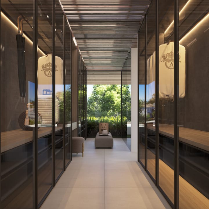 You dress from the walk-in closet, its glass doors framing your collections like a gallery.