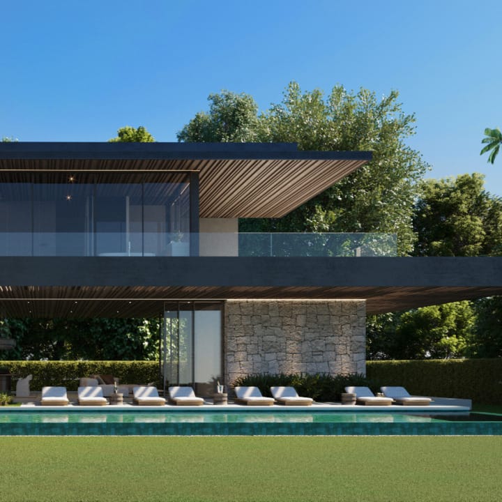 Morning in Marbella begins here with the scent of pine and jasmine drifting across a pool of glassy turquoise. The villa at Las Parcelas del Golf greets you with calm precision: stone, wood, and glass layered into a silhouette that seems to hover above the garden. Sunlight breaks through the slatted pergola, painting shifting patterns across the terrace, the loungers lined up in quiet invitation. You slip into the water, the day still young, the air carrying that coastal freshness only Marbella knows.