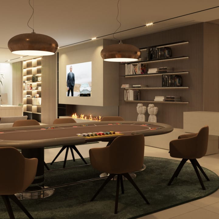 Afternoons unfold lazily. You could be in the shaded lounge, feet tucked into a plush rug as the fireplace flickers beneath a piece of art. Or in the game room downstairs, chips stacked high on the table, laughter bouncing off the walls as a film plays on the wide screen beyond. Every texture—woven fabric, smooth marble, warm wood—feels considered, harmonious. The villa doesn’t demand attention; it seduces with balance.