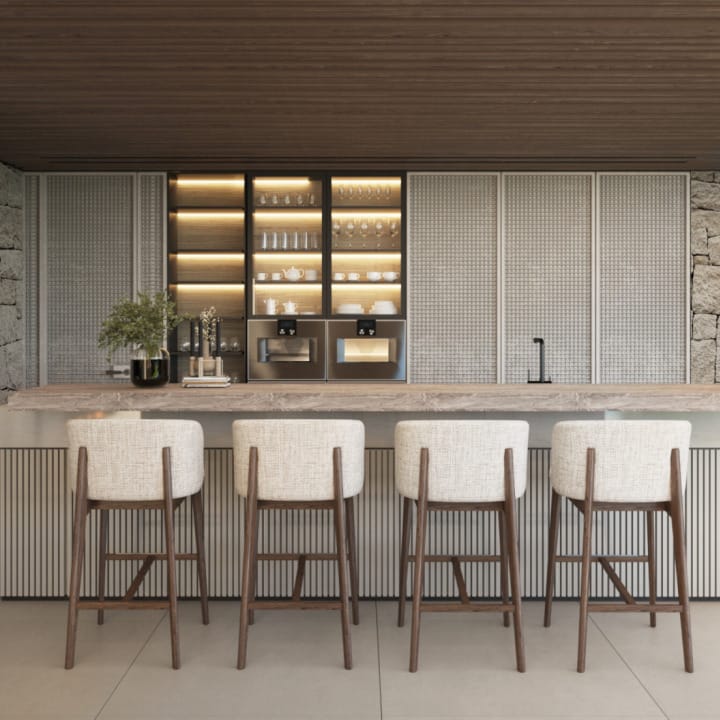 The bar is ready, its shelves softly glowing, morning coffee or evening cocktails both finding their place.