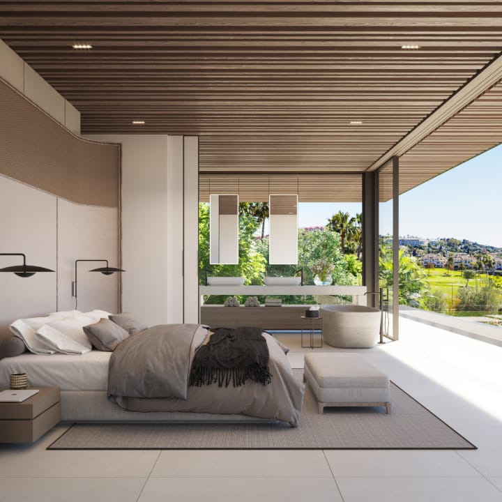 As evening falls, the main suite becomes your sanctuary. Floor-to-ceiling glass slides open, revealing treetops dissolving into golden hills. The bed, low and wide, promises slow mornings and late nights. Behind it, a bathroom more akin to a spa: freestanding basins, soft light, and a view that stretches forever.