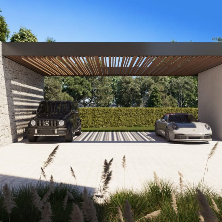 A Porsche and a G-Class wait quietly outside, tucked under the timbered carport, ready for a late drive into town or a dinner by the port.