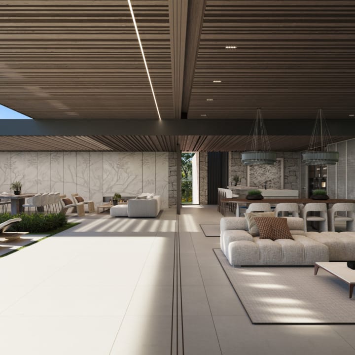 By late morning, you cross the courtyard entrance—a stage in itself. Stone walls rise around you, textured and timeless, while a sculptural tree bends under the hovering upper floor, its branches almost brushing the floating geometry of timber. There’s serenity here, but also theater, a whisper that this is not just a house but a private world. Inside, the lines blur: the living space opens wide to the terrace, pale stone floors flowing outward. A breeze rolls through, carrying with it the chatter of birds and the shimmer of light off the pool.
